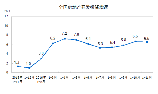 房地產開發投資完成情況 2016年1-11月份,全國房地產開發投資93387億元,同比名義增長6.5%,增速比1-10月份回落0.1個百分點。其中,住宅投資62588億元,增長6.0%,增速提高0.1個百分點。