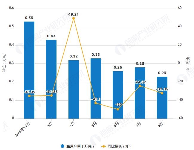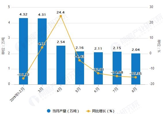 據(jù)國家統(tǒng)計局統(tǒng)計數(shù)據(jù)顯示,2019年1-2季度湖南省化學(xué)農(nóng)藥原藥產(chǎn)量波動幅度不大,2019年7月湖南省化學(xué)農(nóng)藥原藥產(chǎn)量為0.28萬噸,同比下降24.32%。2019年1-8月湖南省化學(xué)農(nóng)藥原藥產(chǎn)量為2.49萬噸,...