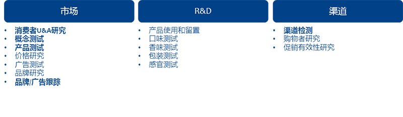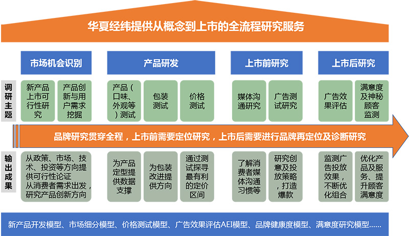 消費品(快消品)研究包含可行性研究、消費者U&A研究、概念測試、市場細分研究、產品測試、新產品創新開發、品牌研究及品牌定位、品牌評估與傳播、廣告及活動效果評估、服務滿意度研究、渠道監測等等。華夏經緯研究團隊提供新產品從機會識別到上市、量產及升級的全流程服務。