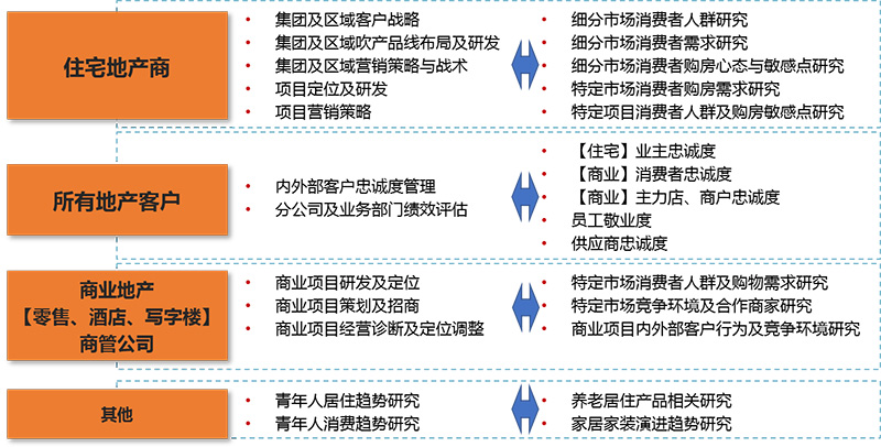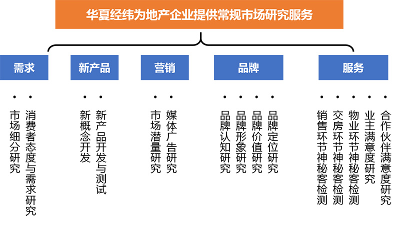 針對地產企業的不同業務部門/模塊,華夏經緯提供多樣化、全覆蓋的市場研究服務,全面助力專項業務能力提升。