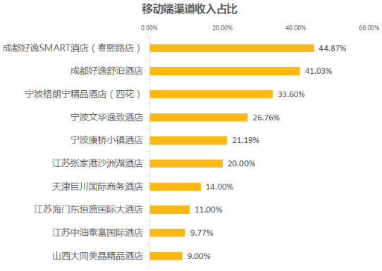 從數據上來看,上榜酒店的移動端渠道收入占比依舊主要集中在10%—40%之間。很多酒店不愿在酒店移動互聯網直銷化精力而寧愿與OTA渠道合作,主要原因是不知道互聯網直銷為酒店能帶來怎樣的收益。從這些榜單數據可以清晰的看到,只要酒店用心去做,移動互聯網直銷渠道將為酒店帶來更多利潤。