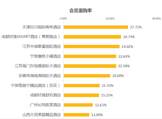 從榜單上來看,6月份的TOP10會員重購率環比5月份相差不大,呈穩定狀態。其中,天津巨川國際商務酒店以27.72%的會員重購率霸占了榜單首位,可喜可賀。另外,與往月類似,6月份的TOP10中大部分酒店的會員重購率依舊保持在20%—30%之間,沒有出現明顯的斷層現象。