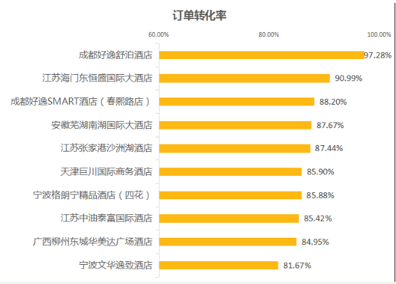 在數據中我們可以看到,榜單中的前十名酒店訂單轉化率都維持在80%以上,尤其是第一名的好逸舒泊酒店,轉化率高達97.28%,相信與其優質的服務和良好的用戶體驗是分不開的。