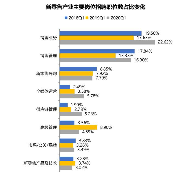ToB的銷售和ToC的導購是新零售的主體崗位,2020年一季度,銷售業務、銷售管理和新零售導購崗位的招聘職位數分別占新零售總體的22.62%、16.90%、7.79%。全媒體運營、供應鏈管理等新零售中臺崗位招聘需求保持增長態勢,2020年一季度招聘職位數占比較2018年一季度均提高超過3個百分點。